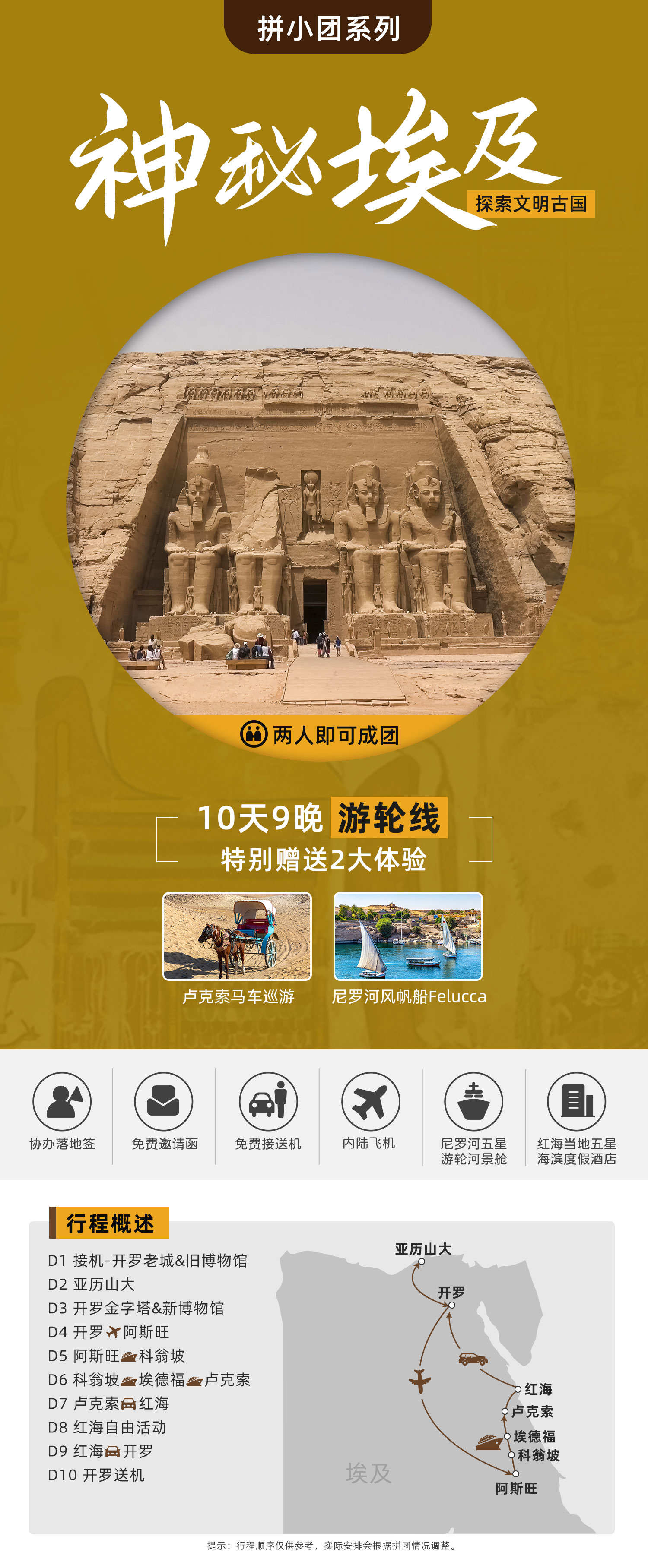 路线名称:<拼小团>【游轮线】埃及开罗+红海+卢克索+阿斯旺+亚历山大10日游(落地签)